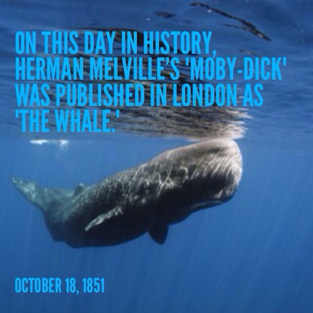 October 18, 1851: On this day in history, Herman Melville's "Moby-Dick" was published in London as "The Whale." It was published in New York City on November 14 of the same year. According to a 2011 survey in American Book Review, the novel's opening line, "Call me Ishmael," rank's first in a list of "100 First Best Lines from Novels."